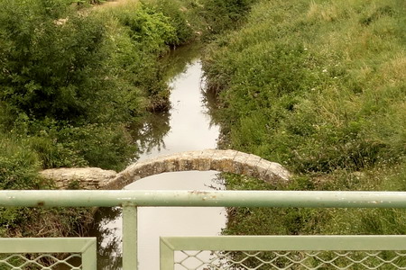 Der Radweg auf der Bahntrasse überquert die Senke und den Bach Rhony auf einer großen Brücke, gleich daneben befindet sich eine kleine, selbsttragende römische Steinbrücke: Pont d'Arnia.