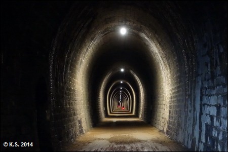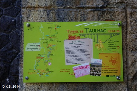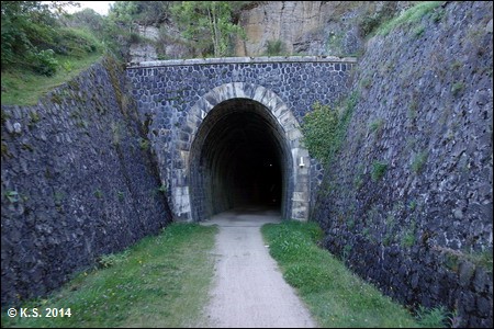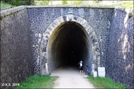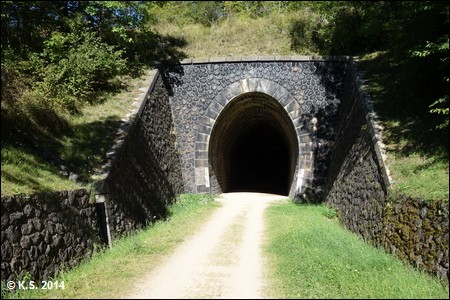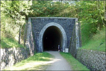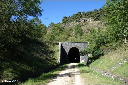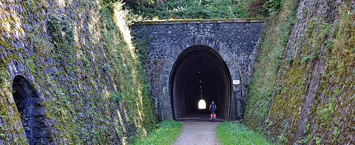 Der Tunnel von Taulhac ist der erste und zweitlängste Tunnel der Strecke. Er ist gut beleuchtet, aber dennoch sollte man das Licht am Fahrrad einschalten!