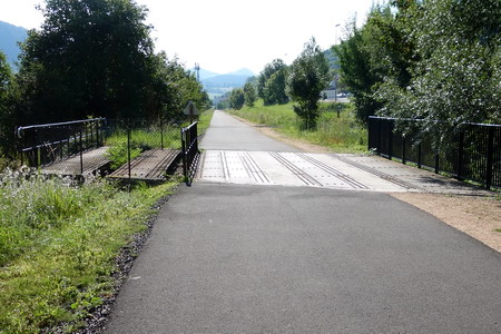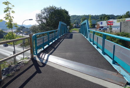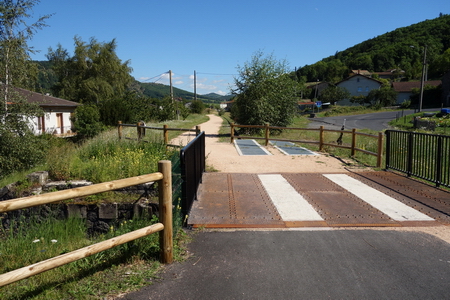 Die blaue Brücke überquert die D373 (Côte de Tireboeuf). Über die alte Eisenbrücke geht es kerzengerade auf glattem Asphalt Richtung Berge.