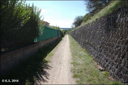 Eines der typischen Streckenwärterhäuschen dieser ehemaligen Bahnlinie. An den Stützmauern entlang geht es weiter bergauf.