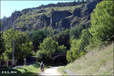 Mitten im Zentralmassiv, in Brives-Charensac, nur 2 Kilometer von Le Puy-en-Velay entfernt, beginnt ein Radweg auf einer stillgelegten Bahntrasse in die Berge dieser Region. Bereits der Startpunkt dieser Voie Verte liegt in etwa 600 m ü.NN und führt auf 26 Kilometern Gesamtlänge durch 5 Tunnel und über ein großes Viadukt in eine Höhe von 1071 m ü.NN. Die Aussicht vom Radweg über die karge Landschaft und ins Tal der Loire ist beeindruckend. In den höheren Lagen, in denen die karge Vegetation und die runden Bergkuppen das Bild bestimmen, muss man mit einem rauen Klima rechnen, und manchmal kommt es selbst im Juni noch zu Schneefällen. Diese Vegetation und das Landschaftsbild haben ihren eigenen Reiz, den kaum ein Radler je vergessen wird.