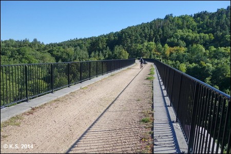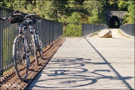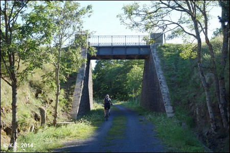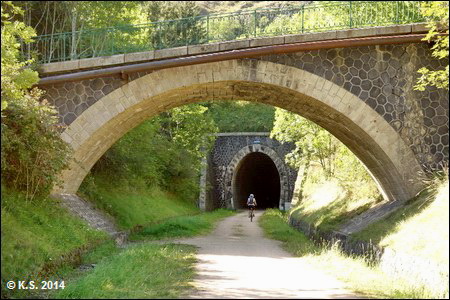 Der Tunnel von Venayres (281 m) ist der letzte und kürzeste des Radwegs und mündet direkt auf das mächtige Viaduc de la Gagne (182 m), eine Konstruktion aus Stein und Stahl.