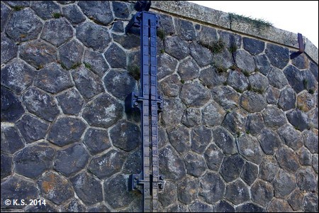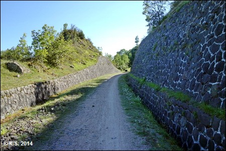 Die steilen Hänge sind befestigt. Wassergräben sorgen für den Ablauf von Regen und Schmelzwasser. Die Sperren sind in grüner "Tarnfarbe" gehalten.