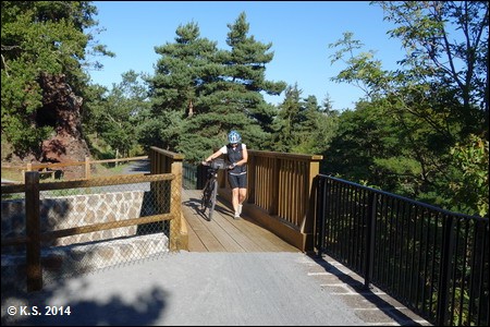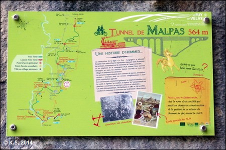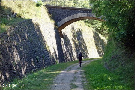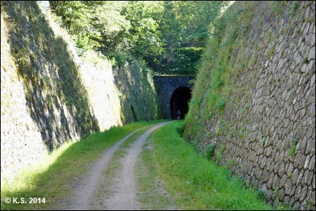 Das Schild am Tunnelportal zeigt auch eine Streckenkarte und enthält Infos zur Geschichte. Aufwändige Mauern und Brücken prägen diesen Abschnitt.