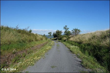 Weiter bergauf erreicht man die N88. Auf dem kurzen Asphaltstück folgt man kurz der Straße, dann wird es ein schottriger Feldweg.