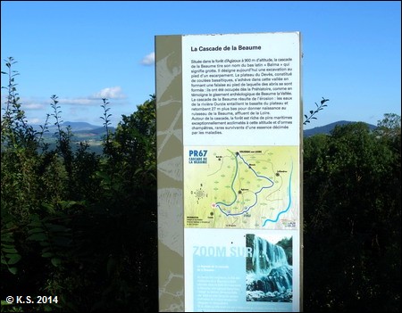 Hier in der Nähe hat die Beaume (oder Ourzie), ein Zufluss der Loire, einen Wasserfall gebildet. Ein Eisenbahnsignal steht am Rand der Trasse.
