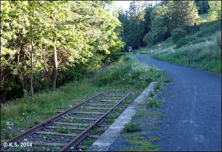 Hier, am Rastplatz, liegt noch ein alter Gleisabschnitt. Nach Überquerung der Straße geht es durch den Wald bis zu einem ausgehöhlten Felsen und über eine Holzbrücke.