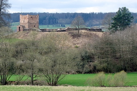 Der Radweg aber bleibt am anderen Ufer der Schlitz und führt abseits der Bahnstrecke über den Berg nach Angersbach. Von einem kleinenSporn grüßt die Burg Wartenberg, dann erreicht man wieder die aktive Bahnstrecke, die im Tal der Lauter verblieben war.