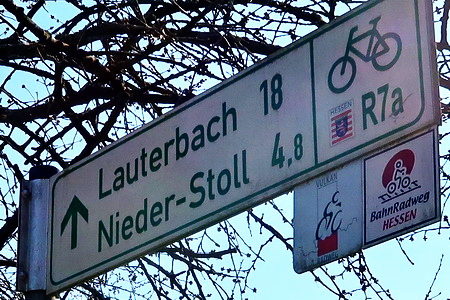 Da der Vulkanradweg auch ein Teil des Bahnradweg Hessen ist, findet man entlang der Strecke auch diese Beschilderung mit Entfernuns- und Höhenangaben. Ab Hutzdorf folgt man dem R7a.