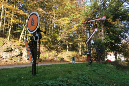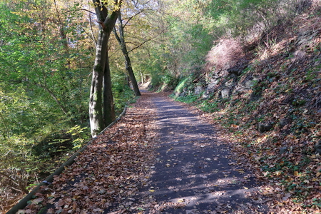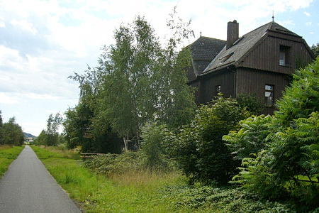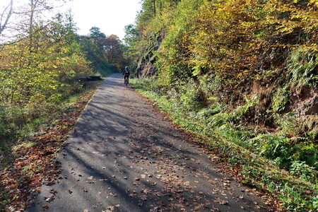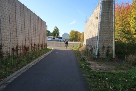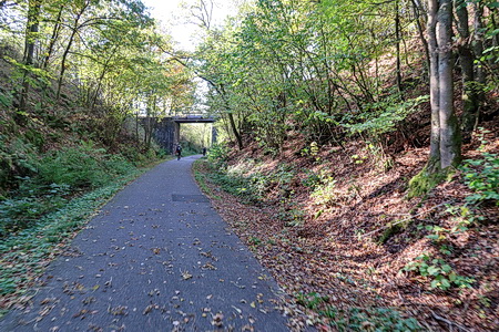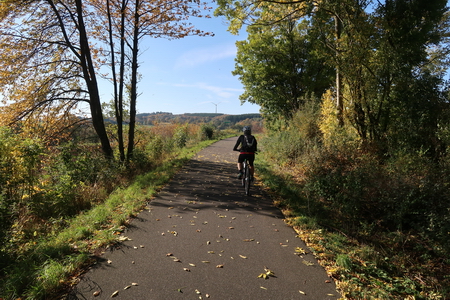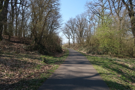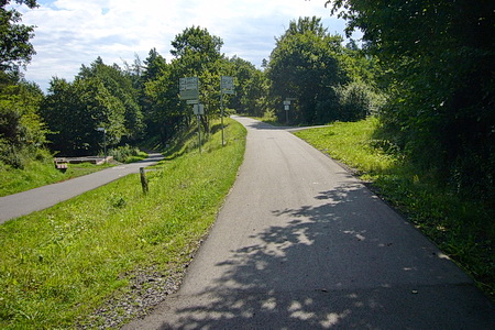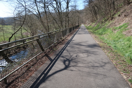 Der Weg steigt weiter an, am Hang entlang wird es etwas enger, Vorsicht bei Gegenverkehr! Dann erreicht man die Bahntrasse, die hier von einem Werksanschluss und dem ehemaligen Südbahnhof her einmündet. In einer Spitzkehre beginnt der Radweg auf der Trasse.