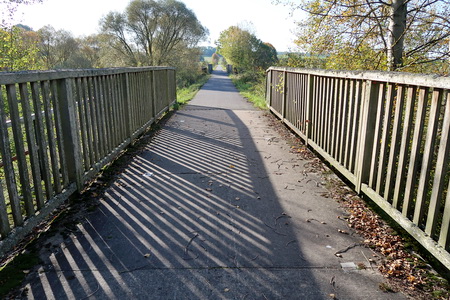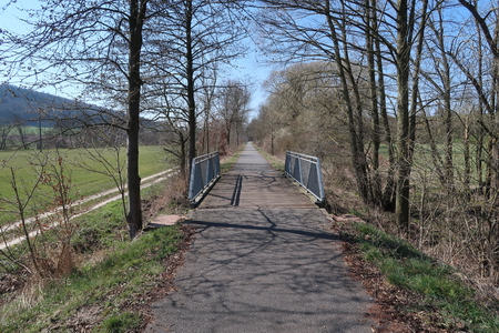 Die Landschaft öffnet sich, vor Rixfeld überspannt eine alte Brücke die Bahntrasse.