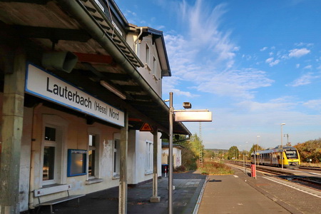 Schade, dass man die Bauwerke nicht in den Radweg eingebunden hat, diese Brücken sind sind eine Attraktion. Die Inschrift auf einem der Pfeiler lautet: Gebaut Anno 1898. Der Bahnhof mit dem weißen Holzvordach ist nicht in bestem Zustand. Hier verkehren die Diesel-Züge zwischen Fulda und Gießen über Lauterbach, einem weiteren Einstieg in den Vulkanradweg.