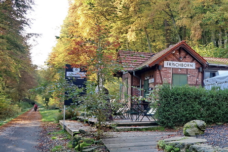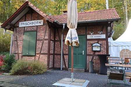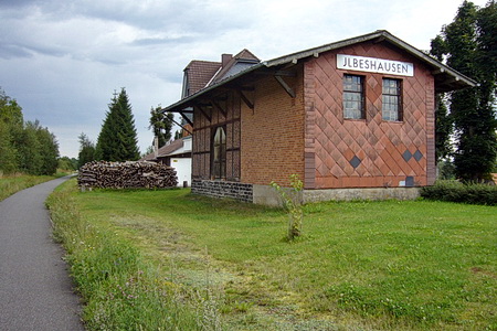 Der Bahnhof Blitzenrod dient als Wohngebäude. Nach der Überquerung der B 275 folgt schon der Haltepunkt Frischborn, heute mit Biergarten (im Sommer).