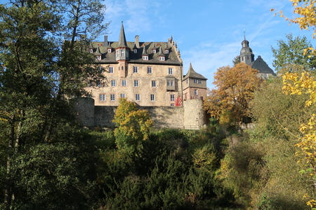 Weiter zum Schloss Eisenbach, das hinter den Bäumen auftaucht. Der Schlosspark ist für Besucher frei zugänglich.