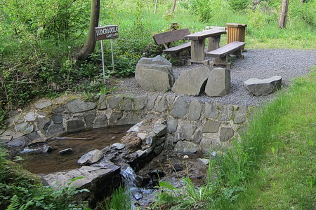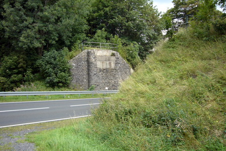 Doch an der Bundesstraße ist Schluss: Es fehlt eine Brücke. Der Radweg knickt links ab und folgt der Straße aufwärts, an der 500 m Höhenmake vorbei. Auf der rechten Seite plätschert die Quelle der Lüder.