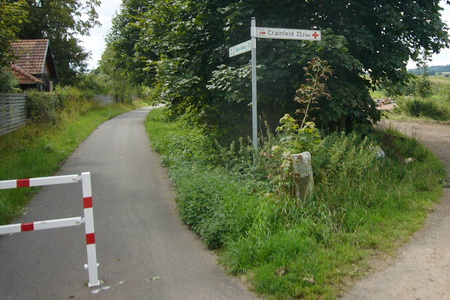 Die Wegweiser sind einwandfrei, noch verläuft der Radweg neben der zugewachsenen Bahntrasse.