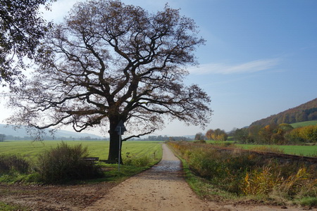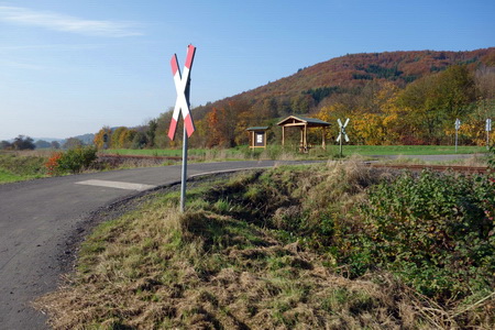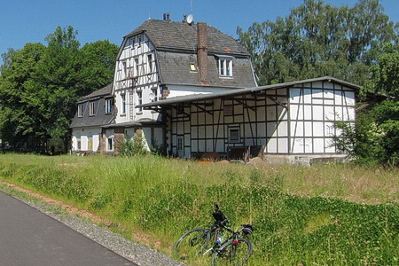 Schon bald biegt die Route ab durch die Felder. Die stillgelegte Bahntrasse wird sichtbar, eine Unterführung in Heddersdorf und das auffällige Bahnhofsgebäude von Frielingen, das wie ein halber Bahnhof erscheint. In Wahlshausen beginnt der Radweg auf der Trasse.