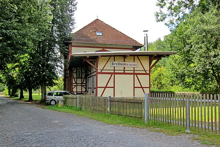 Etwas abseits liegt der alte Bahnhof von Kirchheim. Der Zugverkehr ist lange eingestellt, der Bahnhof wird anderweitig genutzt. Am Ortsausgang von Kirchheim steht eine Infotafel mit den roten Häubchen, der Radweg folgt zunächst der Bundesstraße 454.