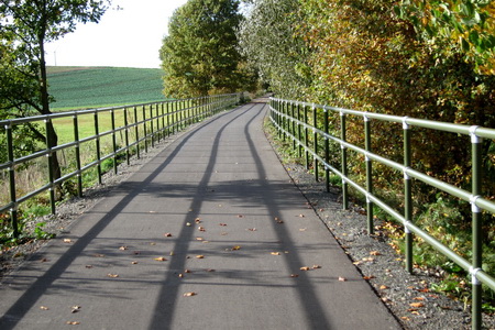 In einer langen Schleife geht es bergauf, ein Brücke überspannt den Radweg. An Geländern wurde hier nicht gespart.