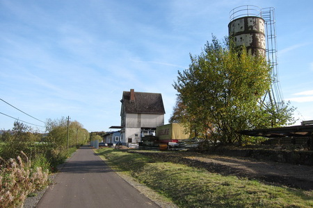 Der Radweg nähert sich dem Haltepunkt Zella. Die alten Silos und Verladeeinrichtung stehen noch neben der Trasse (Blick zurück), ein Bahnhofsgebäude gab es nicht, nur eine Bahnhofsgaststätte 100 m weiter südlich. Eine Bedarfsampel regelt die gefährliche Kreuzung mit der Bundesstraße 254.