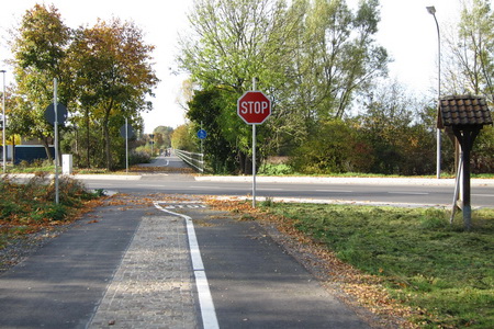 Die Kreuzung mit der Kreisstraße 111 wurde in schon bekannter Weise ohne Sperren gestaltet, an Geländern hat man auch hier nicht gespart.