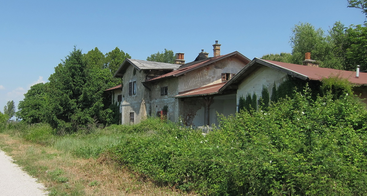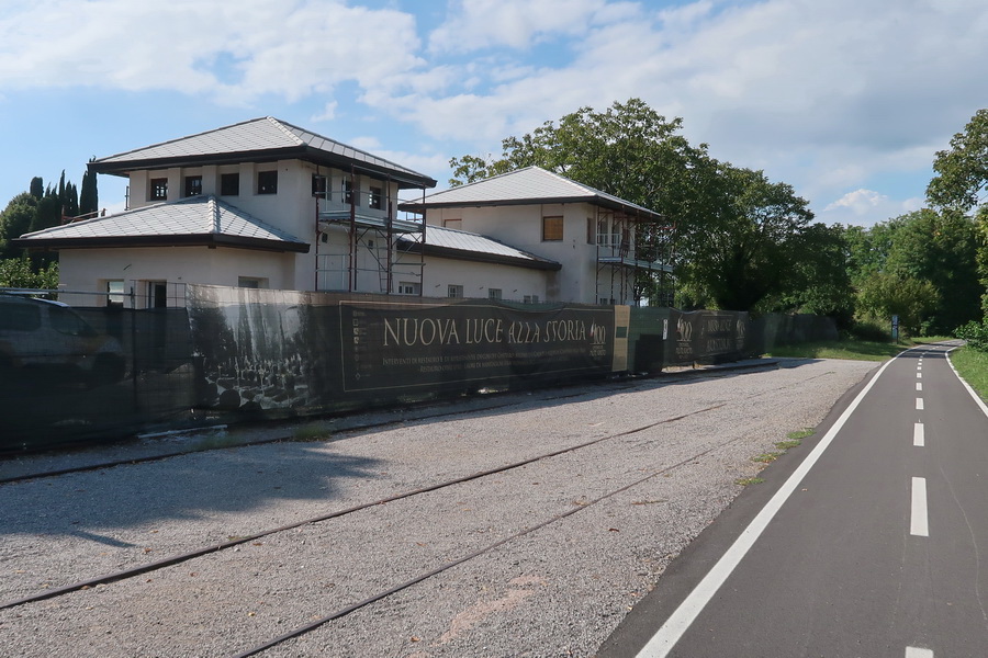 Nur ein paar Schritte weiter erreicht man den ehemaligen Bahnhof von Aquileia. Das Gebäude befand sich in ruinösem Zustand und wird nun aber restauriert. Hier liegen noch Gleisreste. Der Radweg verläuft direkt daneben.