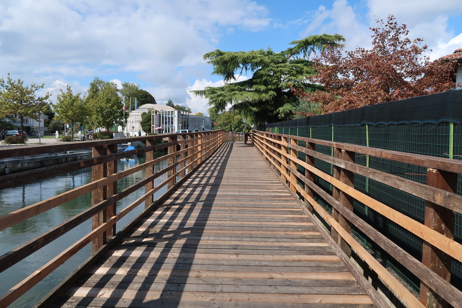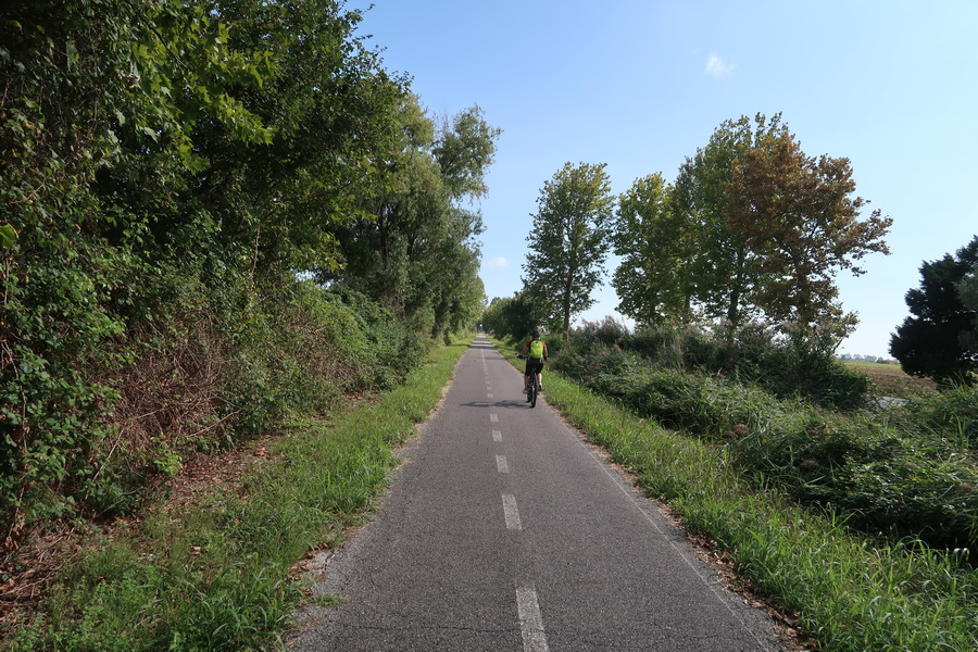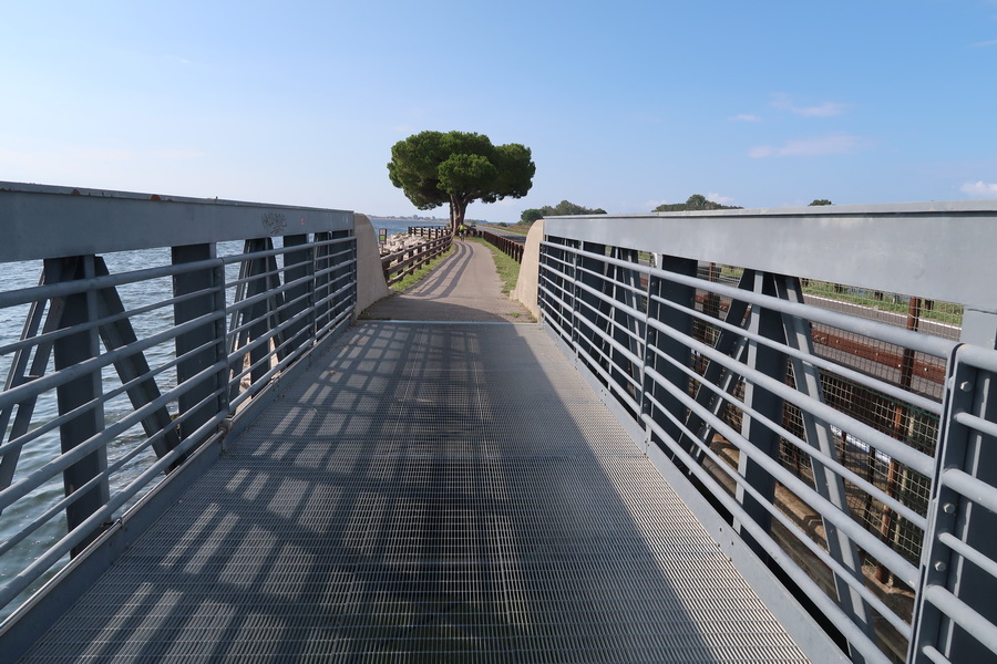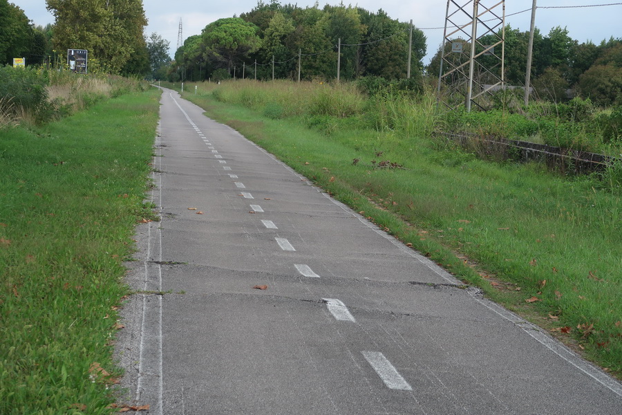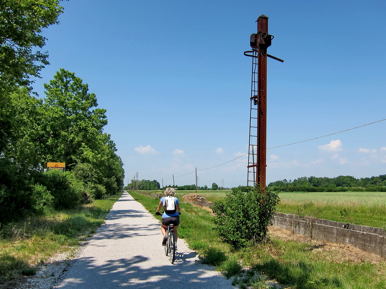 Der Radweg auf der ehemalgen Bahnstrecke zwischen Cervignano de Friuli, einer Gemeinde in Friaul Julisch Venetien mit ca. 14.000 Einwohnern und der Lagunenstadt Grado ist das letzte Teilstück der 8. Etappe des Alpe-Adria Radwegs. Beim Bau der Bahnstrecke im Jahr 1909-1910 gab es noch keine Verbindung zur Stadt Grado über einen Damm, der erst 1936 gebaut wurde. So mussten die Passagiere, die nach Grado wollten, bei dem Ort Belvedere auf die Fähre umsteigen. Heute verbindet ein ca. 5 km langer Damm mit separatem Radweg die Lagunenstadt mit dem Festland.
