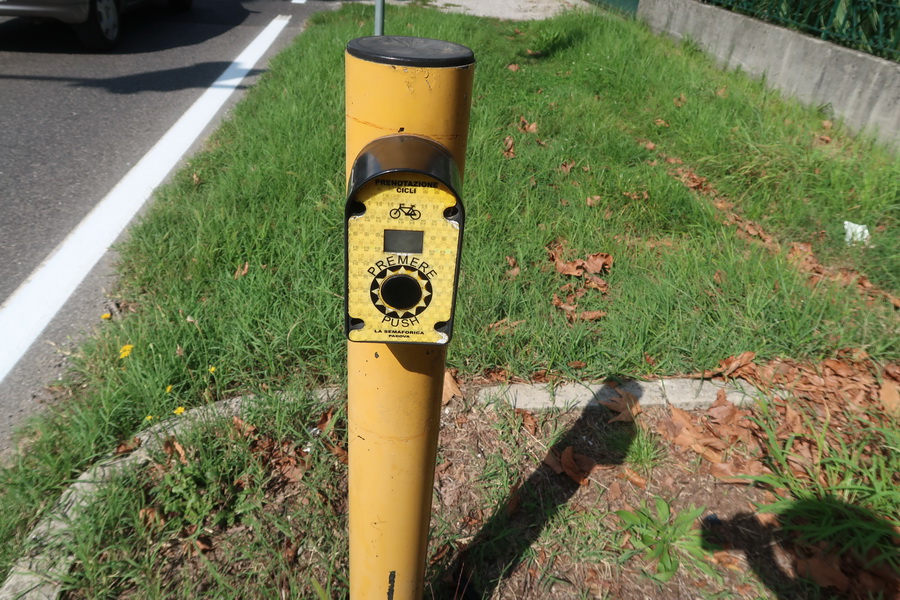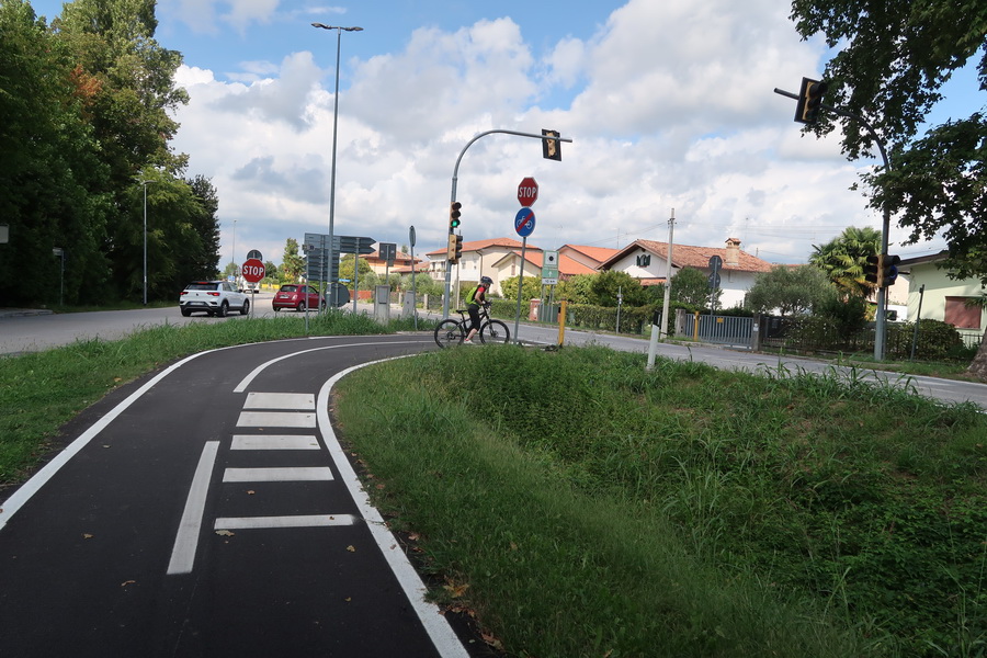 An einer Ampel muss die Straße überquert werden. (Blick in Gegenrichtung!) Nun ist man auf dem neuen Abschnitt des Radwegs am Rande von Terzo die Aquileia.