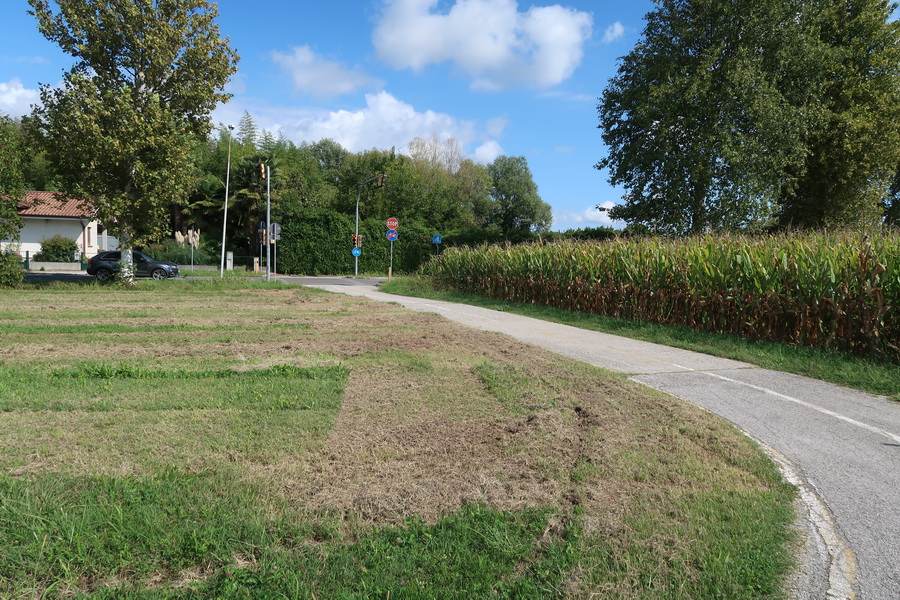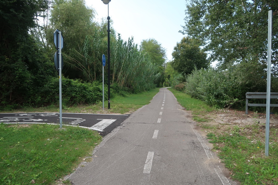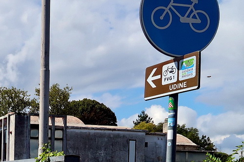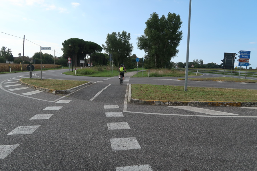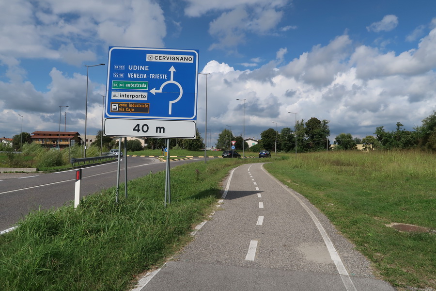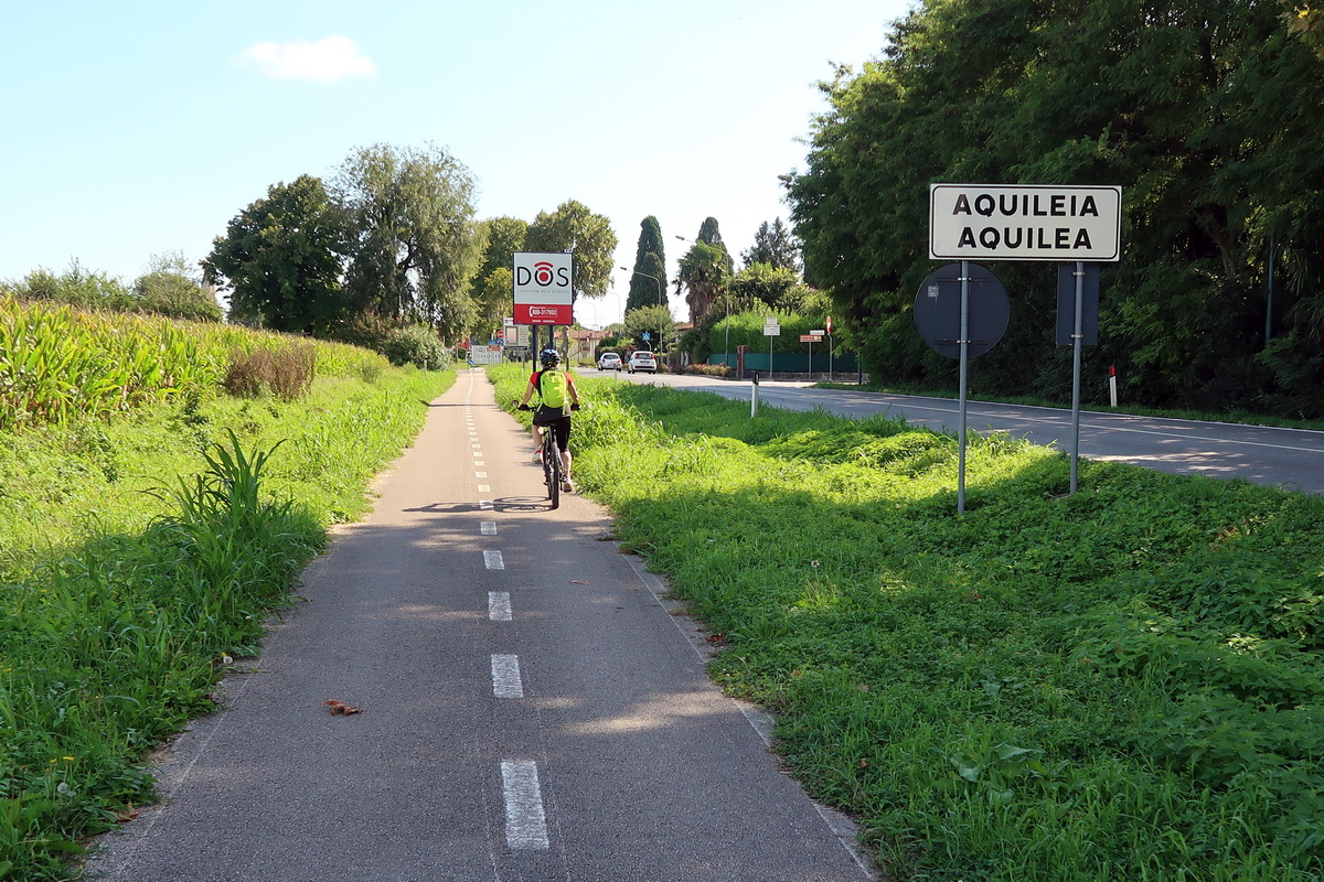 Am Kreisverkehr in der Via Giulia Augusta trifft man auf den Radweg (Blick zurück). In Richtung Terzo folgt man dem Radweg entlang der Straße (Via Aquileia) und den Wegweisern des Alpe-Adria Radwegs.