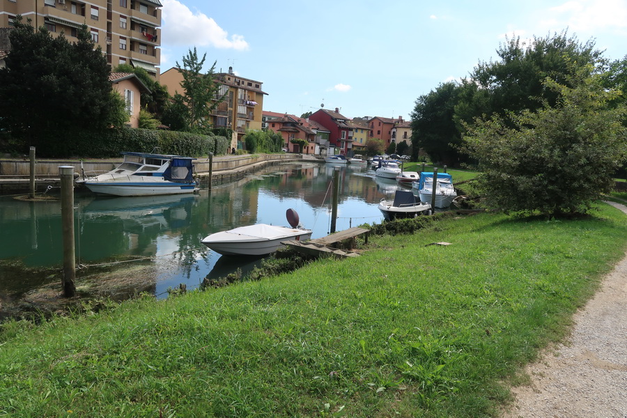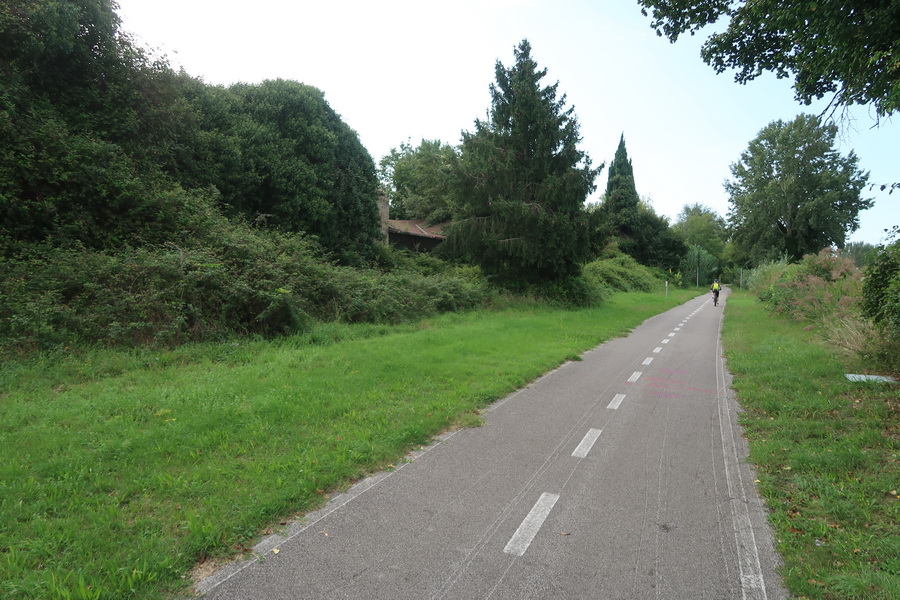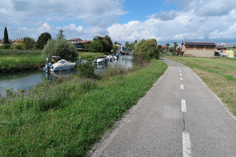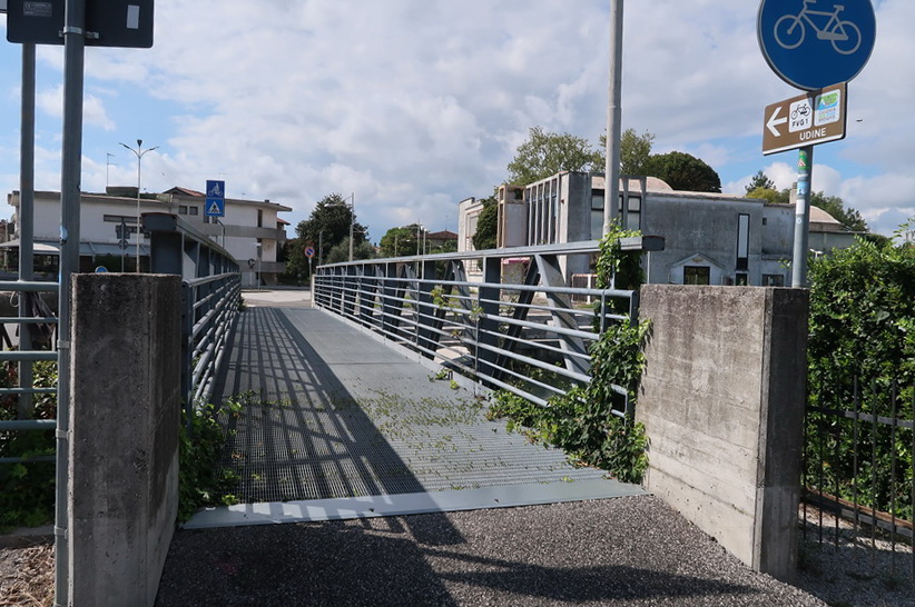 Wir beginnen die Fahrt in Cervignano (ca. 13000) Einwohner. Der Bahnhof unserer Strecke ist in die aktive Bahnstrecke nach Monfalcone und Triest übergegangen. In südlicher Richtung zum Ortsausgang fährt man auf der Straße, später auch auf einem straßenbegleitendem Radweg. Der Fluss Ausa streift den nordwestlichen Ortsteil, wir halten uns weiter südlich.