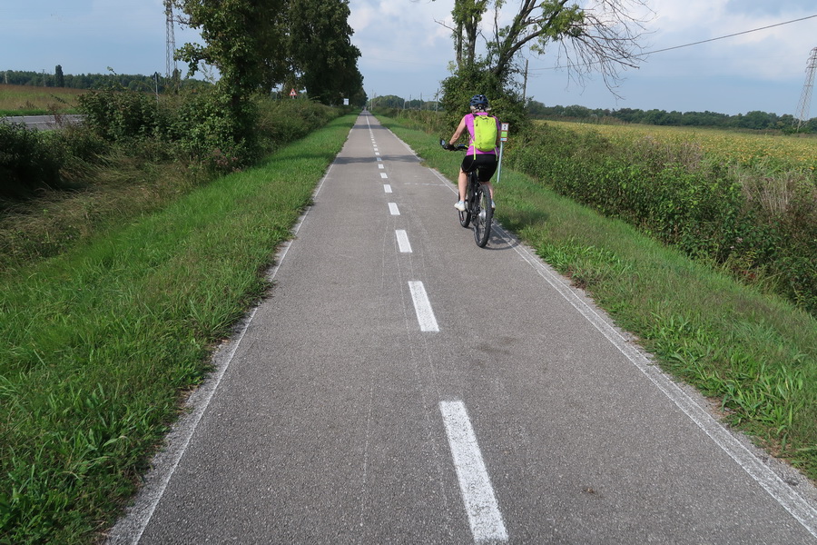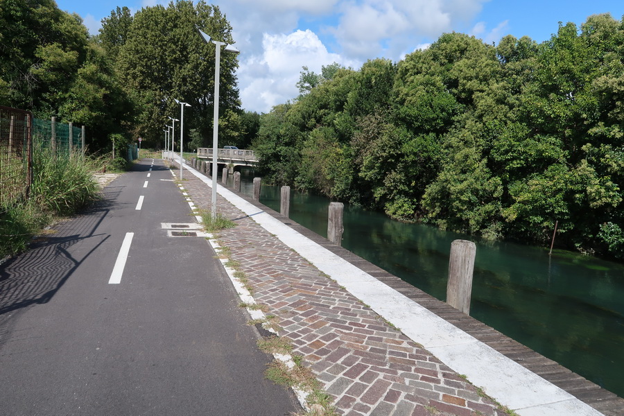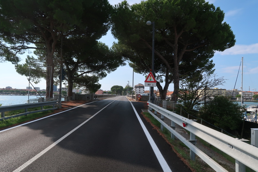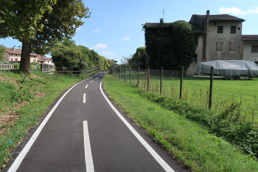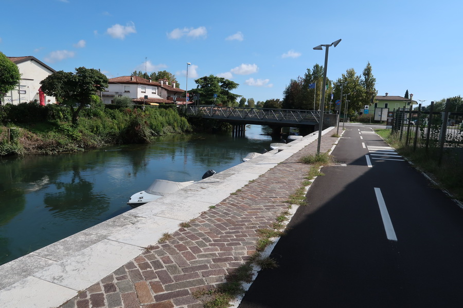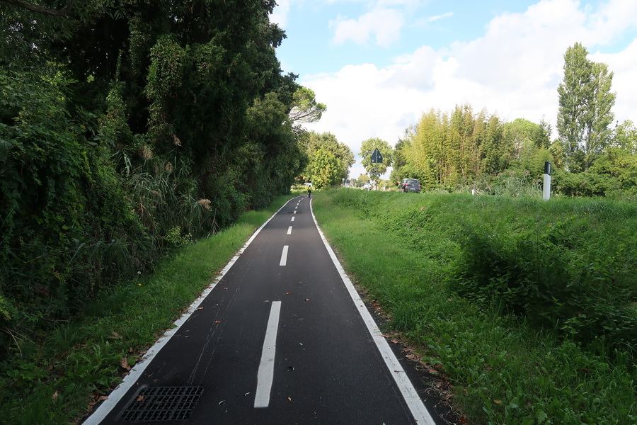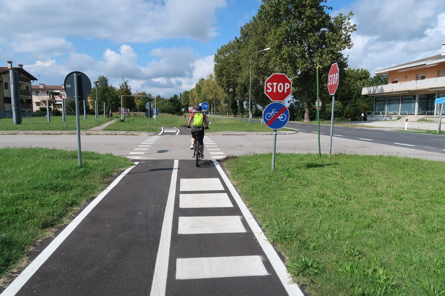 Zwar an allen Querwegen "Stop" für die Radler, aber immerhin ein Radweg. Auch am Fluss Terzo (Fiume Terzo) ist der Radweg auch fertig. Vorsicht, kein Geländer zum Fluss!