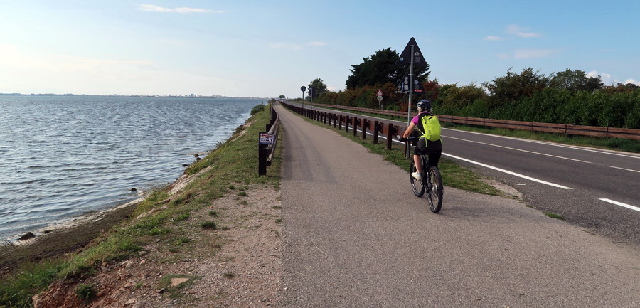 Der Damm mit dem Radweg ist ein Highlight für die Radfahrer auf den letzten 5 km des Alpe-Adria-Radwegs.