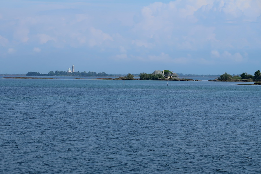 Blick in die Ferne über die Lagune von Grado zur Insel Barbana mit dem Kloster und der Marienkirche.