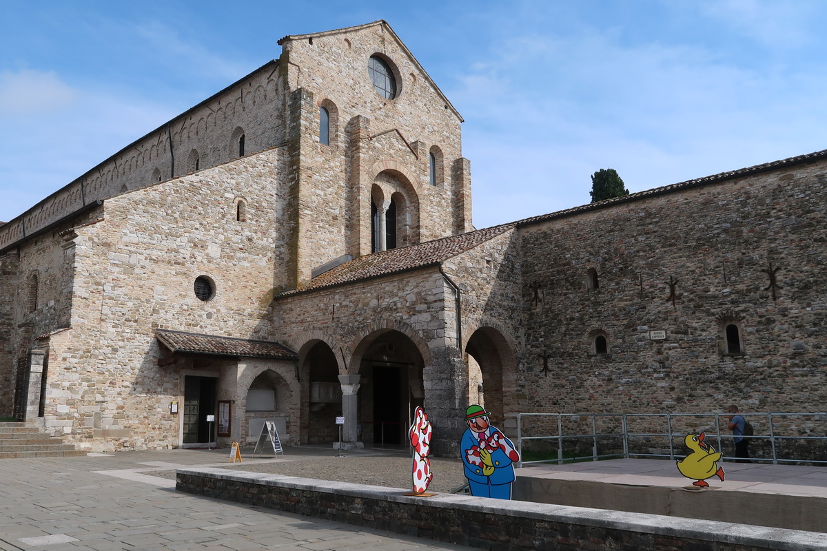 Rechts vor uns liegt die Basilika von Aquileia (Basilika Santa Maria Assunta) mit dem weithin sichtbaren Glockenturm (Campanile). Im Inneren befindet sich das berühmte frühchristliche Mosaik.