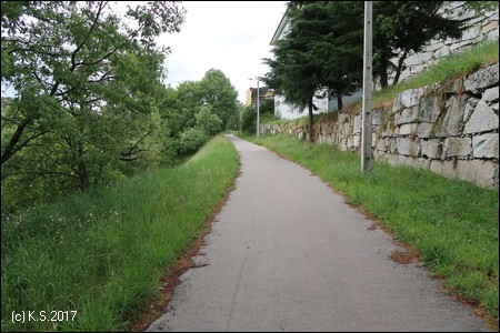 Am Hang entlang unterhalb der N2 verlässt der Radweg das Stadtgebiet in nordöstlicher Richtung, die nächsten 10 km nur bergab. Vorsicht, marode Pfosten im Verlauf des Radwegs!