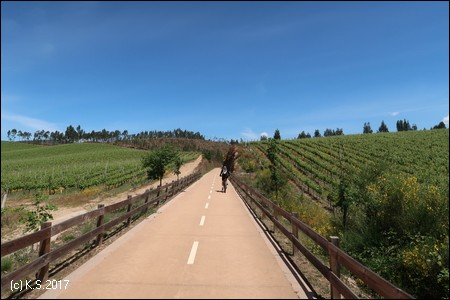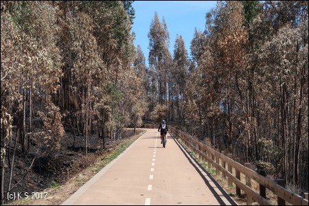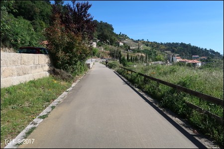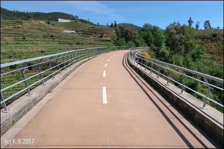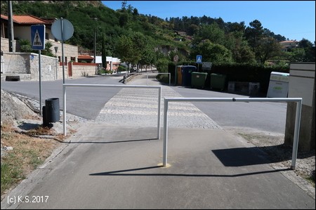 An der nächsten großen Brücke (Ponte do Barreirinho) beginnt wieder der Fahrbahnausbau. Die Brücke mit zwei Natursteinpfeilern und einem Träger aus Beton hat ein neues Geländer bekommen. Die rote Fahrbahn sieht sauber und gepflegt aus. Leider behindern zwei Pfostensperren in der Fahrbahn die Radler.