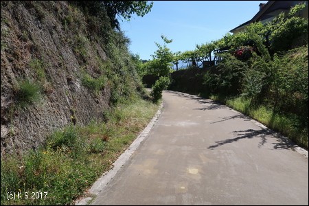Nun steigt die Strecke wieder an, führt leicht aufwärts durch Einschnitte und vorbei an den Weinbergen. An den Querwegen stehen die alten Warnschilder: Vorsicht, Zugverkehr! Halte an, höre und schaue!