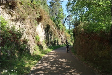Einschnitt durch die rötlichen Felsen, ein Radweg vom Feinsten, gut gepflegt!