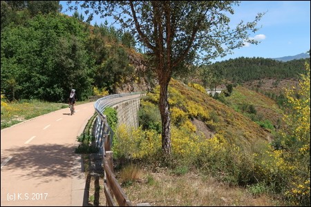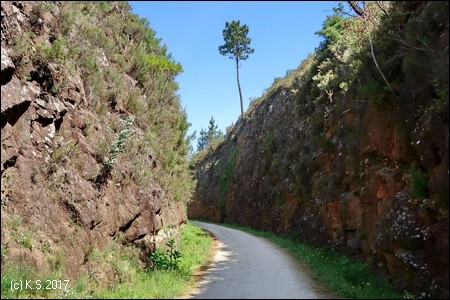 Hier war einmal der Haltepunkt Britelo. Es geht etwas aufwärts, wieder durch Einschnitte, dann am Hang des Tamega-Tales entlang.