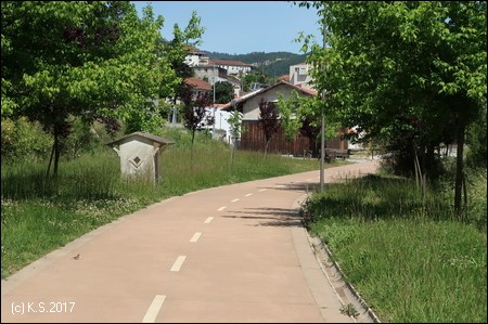 Der Radweg verlässt das Bahnhofsgelände in nördlicher Richtung, hier gibt es reichlich Parkplätze für Besucher. In einer großen Schleife gewinnt die Trasse wieder an Höhe und führt dann unter der N210 durch.
