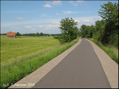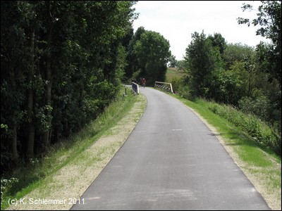 (Blick zurück). Mit Sicherungsgeländern war man bei diesem Radweg wohl etwas geizig (siehe weiter unten), hier aber einmal ein abgesicherter Bereich.
