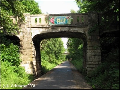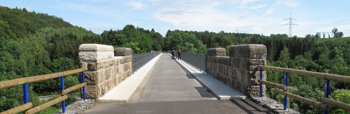 Das fantastische Selbacher Viadukt (193 m lang, 28 m hoch), das aufwändig restauriert wurde, ist vom Radweg aus leider nicht zu sehen. Zwar ist die Fahrt über das mächtige Bauwerk mit tollem Ausblick ins Tal eine Attraktion, wer die Dimensionen des Viadukts aber so richtig wahrnehmen will, muss die Fahrt über einen holprigen Feldweg hinab ins Tal des Reiherbachs in Kauf nehmen (und wieder hinauf auf den Radweg!). Inzwischen sind auch einige Rastplätze mit Regenschutz am Radweg entstanden, und es gibt Cafes und Gaststätten an der Strecke (z.B. Gut Heide, Bahnhof Netze).