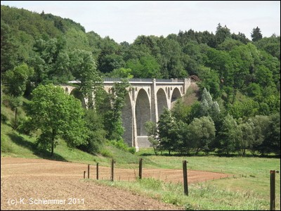Eine Informationstafel erklärt die Geschichte: Von 1910 bis1913 erbaut, im 2. Weltkrieg zerstört, 1946 wieder aufgebaut. 7 Bögen von 25 m Spannweite, 193 m lang, 28 m hoch über demTal.