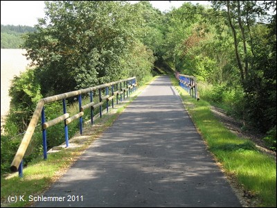 Über die Kuppe, dann folgt man der Straße 1,5 km und knapp 60 Höhenmeter bergab nach Affoldern . Hier trifft man auf die stillgelegte Bahnstrecke Richtung Hemfurth, die teilweise als Draisinenstrecke genutzt wird. Der R 5 (Eder-Fulda-Werra) folgt dem Fluss talwärts, zur Staumauer geht es flussaufwärts.