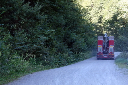 Vorsicht, die großen Holztransporter lassen dem Radler nur wenig Raum, es staubt gewaltig! Rechtzeitig ausweichen.
