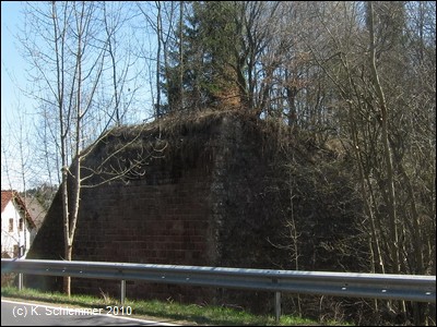 Doch schon beim Steinbruch Niederehe ist wieder Schluss mit der Bahntrassse. Nach dem Ort überqueren wir die Straße, passieren die Reste einer alten Brücke und folgen dem Niedereher Bach auf einem asphaltierten Wirtschaftweg.