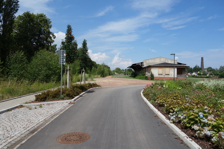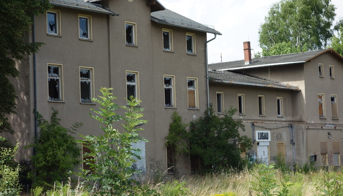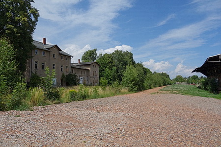 Wir starten in Lugau an der Abzweigung von der B180 zum alten Bahnhofsgelände. Hier, am Güterschuppen, ist eine Parklandschaft enstanden. Das Empfangsgebäude liegt umgeben von üppiger Vegetation im Hintergrund, etwas abseits vom Radweg. Im Jahre 2015 war es eher eine Ruine mit geborstenen Fenstern und vernachlässigter Fassade. Inzwischen müssten die geplanten Ausbauarbeiten weit fortgeschritten sein.