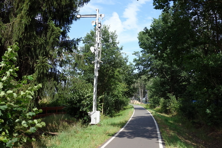 Ein gut erhaltenes Signal, dann ein moderner, überdachter Rastplatz am Rande der Strecke