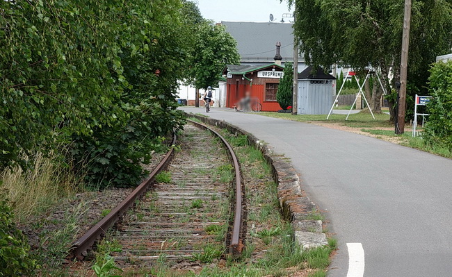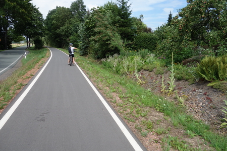 .....dann endet der Radweg an der Straße (Stand 2015). Nur etwa 1,5 km fährt man auf einer Asphaltstraße zum ehemaligen Haltepunkt Mittelbach (2015). Der weitere Ausbau auf der Trasse nach Mittelbach und Wüstenbrand soll folgen.