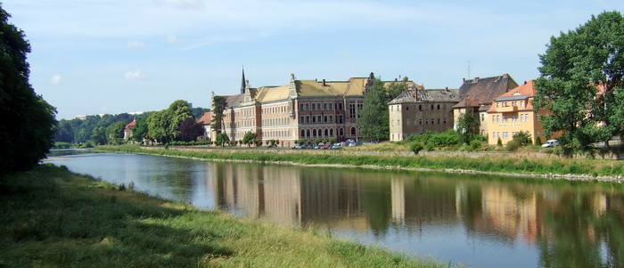 Durch einen Einschnitt geht es am Fluss entlang mit schönem Blick auf die Stadt Grimma, die nach der Flut aufwändig restauriert wurde